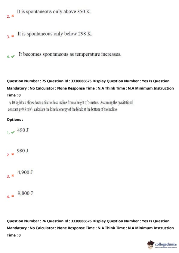 Question 75: A 10 kg block slides down a frictionless incline from a height of 5 meters. Assuming the gravitational constant g=9.8 m/s\(^2\), calculate the kinetic energy of the block at the bottom of the incline.