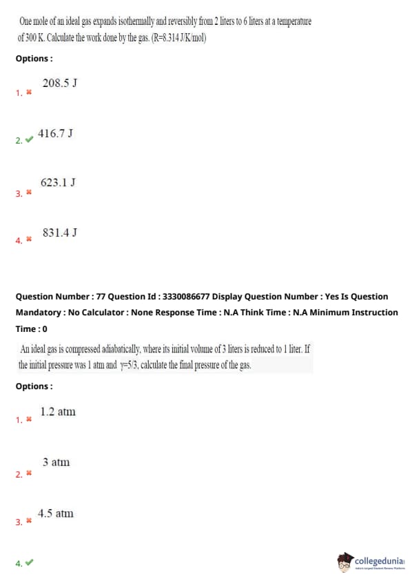 Question 77: An ideal gas is compressed adiabatically, where its initial volume of 3 liters is reduced to 1 liter. If the initial pressure was 1 atm and \(\gamma=5/3\), calculate the final pressure of the gas.
