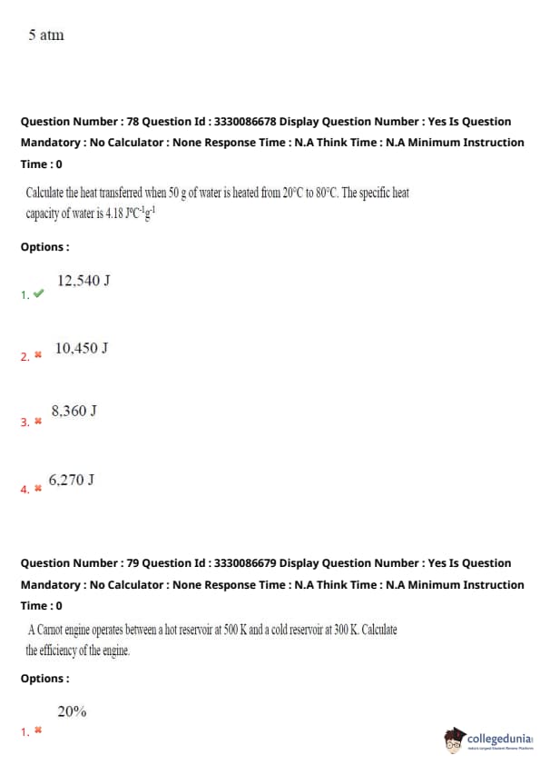 Question 78: Calculate the heat transferred when 50 g of water is heated from 20\(^\circ\)C to 80\(^\circ\)C. The specific heat capacity of water is 4.18 J/\(^\circ\)C\(^{-1}\)g\(^{-1}\)