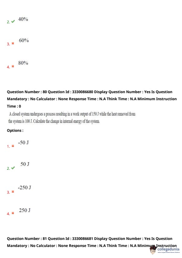 Question 80: A closed system undergoes a process resulting in a work output of 150 J while the heat removed from the system is 100 J. Calculate the change in internal energy of the system.