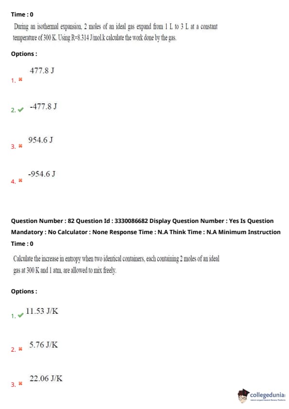 Question 82: Calculate the increase in entropy when two identical containers, each containing 1 mole of an ideal gas at 300 K and 1 atm, are allowed to mix freely.