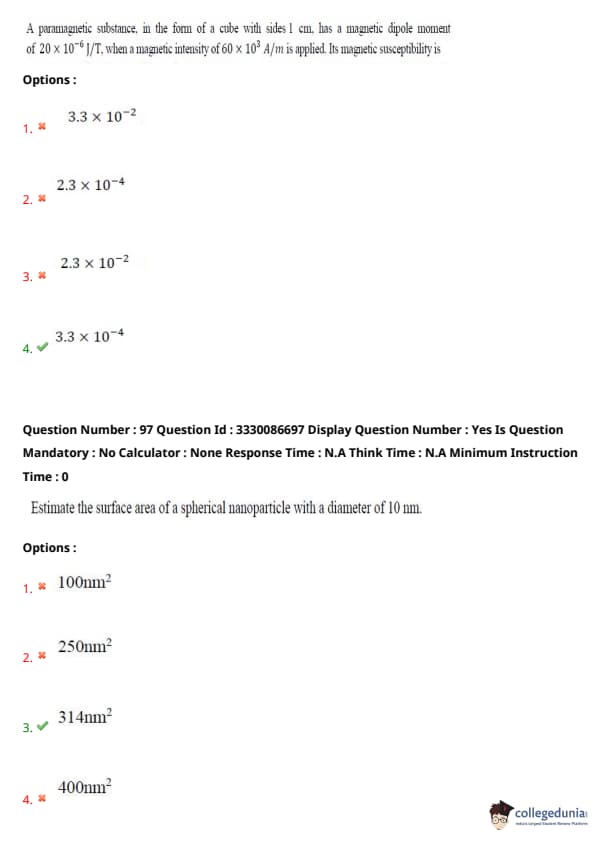 Question 95: A paramagnetic substance, in the form of a cube with sides 1 cm, has a magnetic dipole moment of 20 x 10\(^{-6}\) J/T, when a magnetic intensity of 60 x 10\(^3\) A/m is applied. Its magnetic susceptibility is