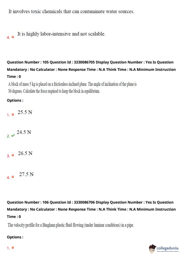 Question 104: A block of mass 5 kg is placed on a frictionless inclined plane. The angle of inclination of the plane is 30 degrees. Calculate the force required to keep the block in equilibrium.