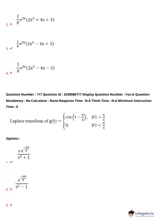 Question 116: Laplace transform of \( g(t) = \begin{cases} \cos(t-\frac{\pi}{3}), & if t > \frac{\pi}{3}