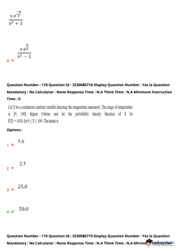 Question 117: Let X be a continuous random variable denoting the temperature measured. The range of temperature is [0, 100] degree Celsius and let the probability density function of X be f(x) = 0.01 for \(0 \le X \le 100\). The mean is