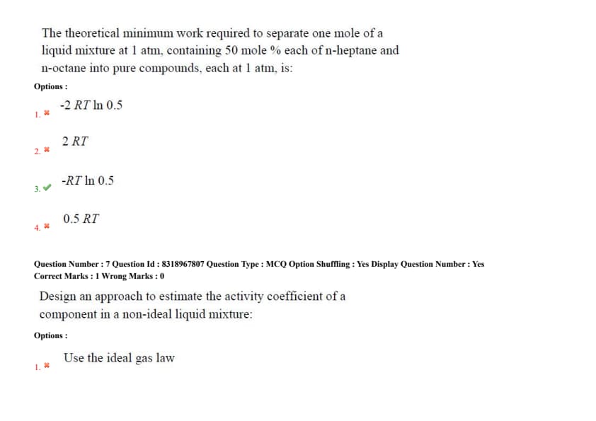 The theoretical minimum work required to separate one mole of a liquid mixture at 1 atm, containing 50 mole % each of n-heptane and n-octane into pure compounds, each at 1 atm, is: