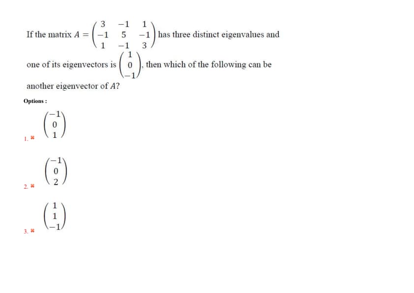 1 & -1 & 3 \end{pmatrix}\) has three distinct eigenvalues and one of its eigenvectors is \(\begin{pmatrix} 1