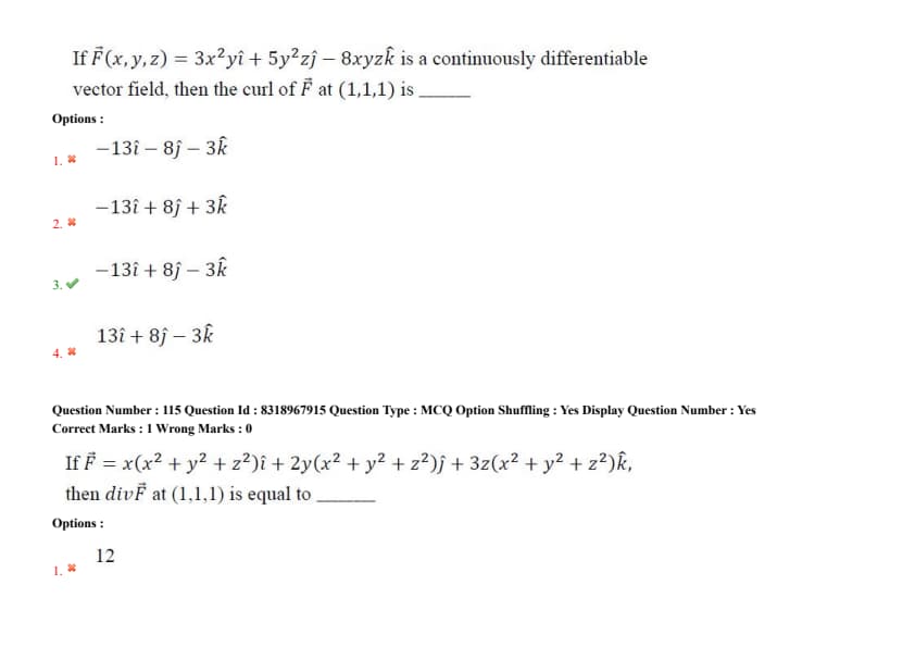 If \(\vec{F}(x, y, z) = 3x^2y\,\hat{i} + 5y^2z\,\hat{j} - 8xyz\,\hat{k}\) is a continuously differentiable vector field, then the curl of \(\vec{F}\) at (1,1,1) is ...............