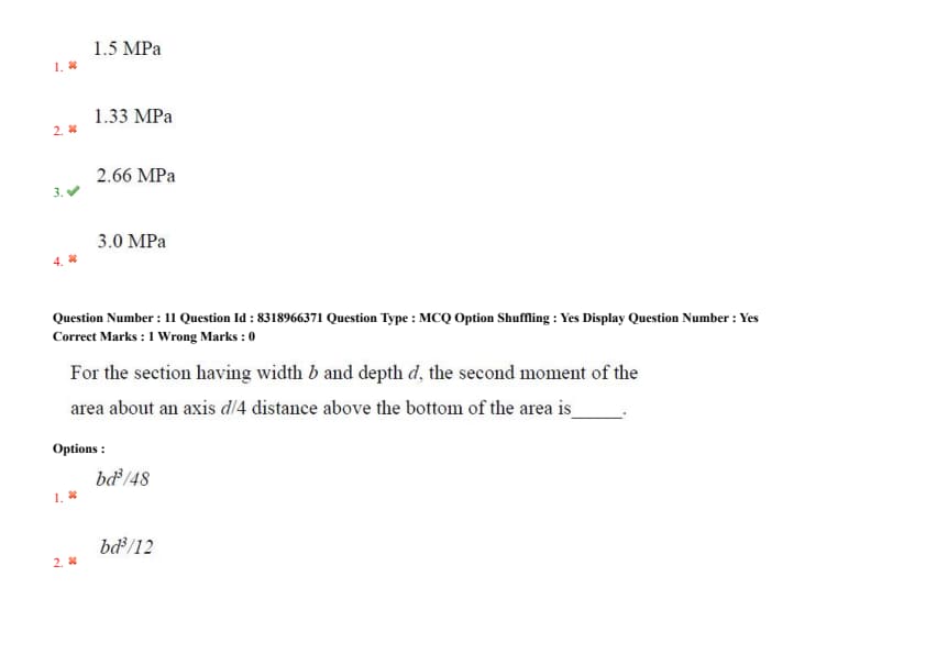 For the section having width \( b \) and depth \( d \), the second moment of the area about an axis \( d/4 \) distance above the bottom of the area is ............
