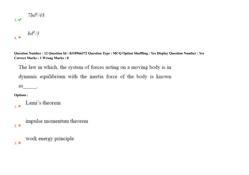 The law in which, the system of forces acting on a moving body is in dynamic equilibrium with the inertia force of the body is known as ............