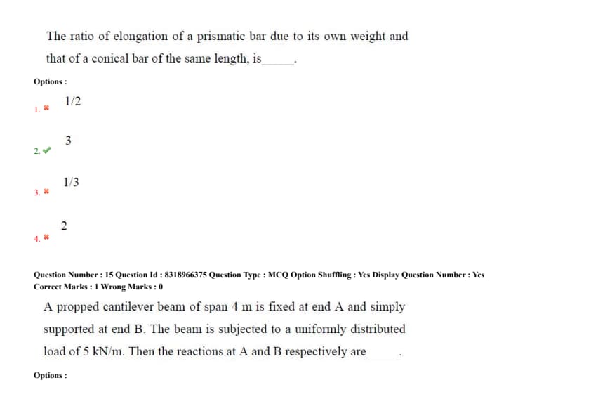 The ratio of elongation of a prismatic bar due to its own weight and that of a conical bar of the same length is ............