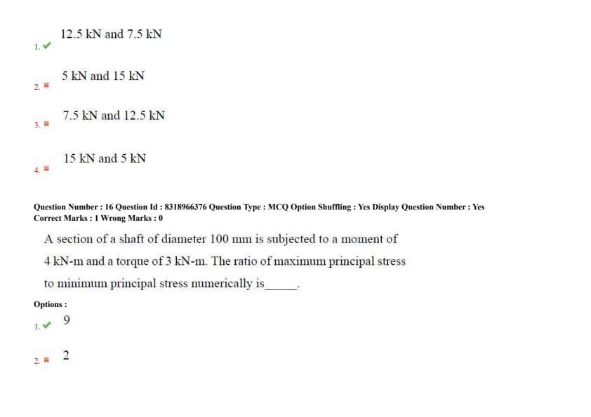 A section of a shaft of diameter 100 mm is subjected to a moment of 4 kN-m and a torque of 3 kN-m. The ratio of maximum principal stress to minimum principal stress numerically is ............