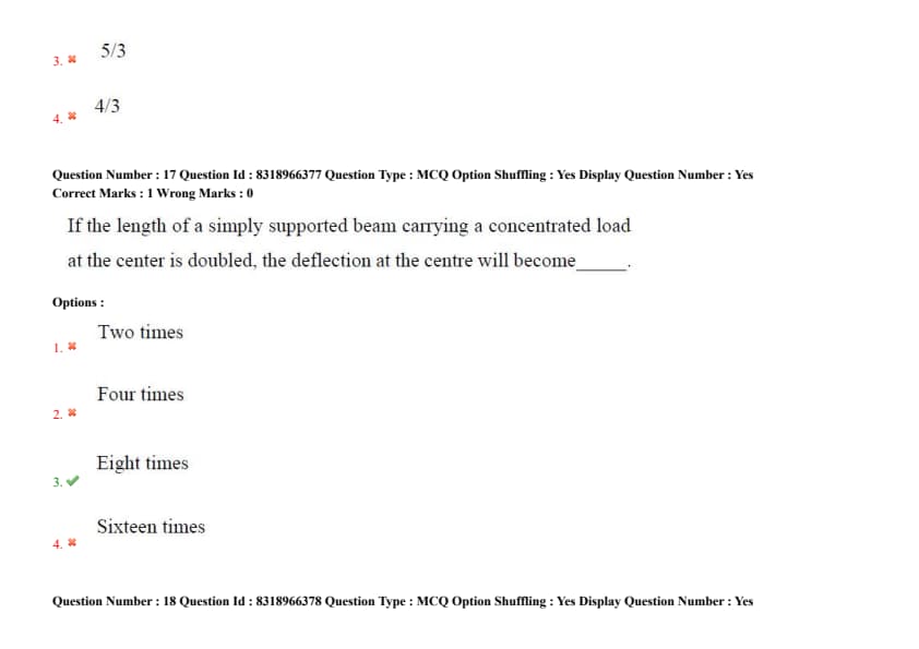 If the length of a simply supported beam carrying a concentrated load at the center is doubled, the deflection at the center will become .......