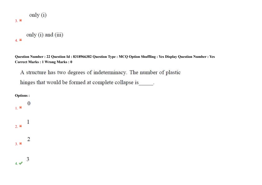 A structure has two degrees of indeterminacy. The number of plastic hinges that would be formed at complete collapse is .......