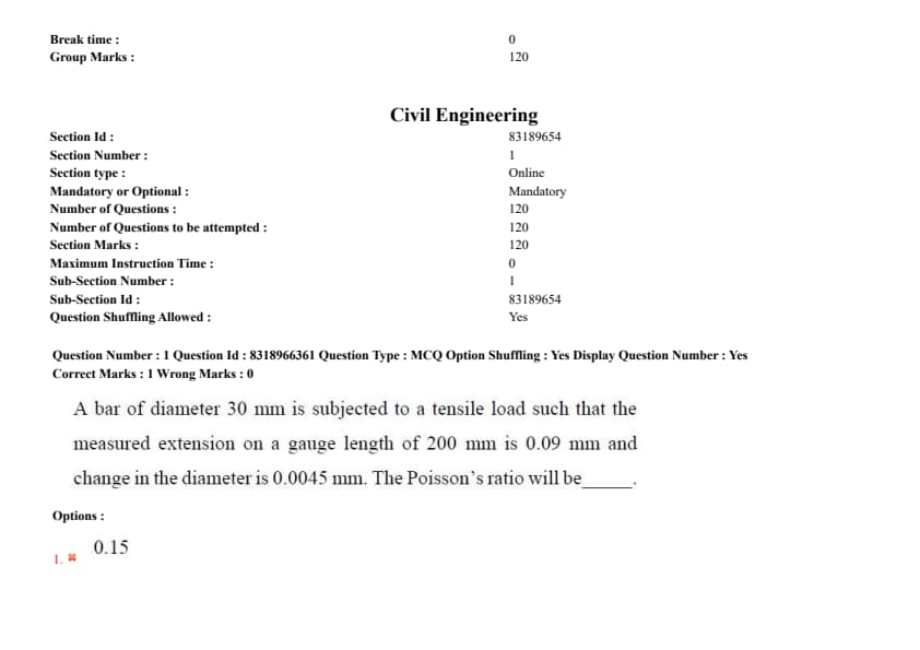 A bar of diameter 30 mm is subjected to a tensile load such that the measured extension on a gauge length of 200 mm is 0.09 mm and the change in the diameter is 0.0045 mm. The Poisson’s ratio will be ...........
