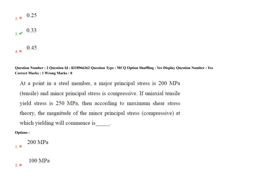 At a point in a steel member, a major principal stress is 200 MPa (tensile) and minor principal stress is compressive. If uniaxial tensile yield stress is 250 MPa, then according to maximum shear stress theory, the magnitude of the minor principal stress (compressive) at which yielding will commence is ...........
