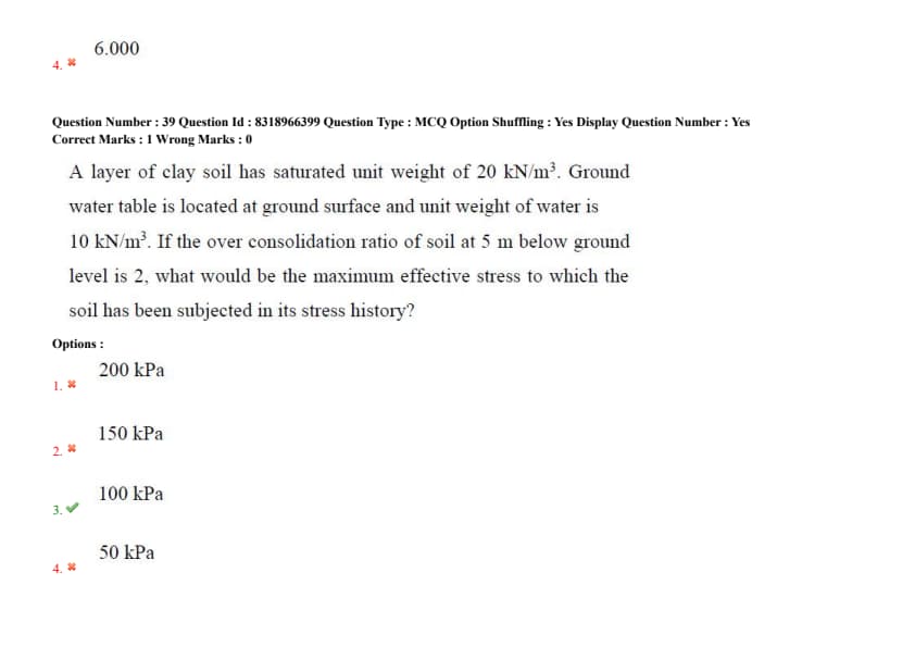 A layer of clay soil has saturated unit weight of 20 kN/m\(^3\). Ground water table is located at ground surface and unit weight of water is 10 kN/m\(^3\). If the over consolidation ratio of soil at 5 m below ground level is 2, what would be the maximum effective stress to which the soil has been subjected in its stress history?