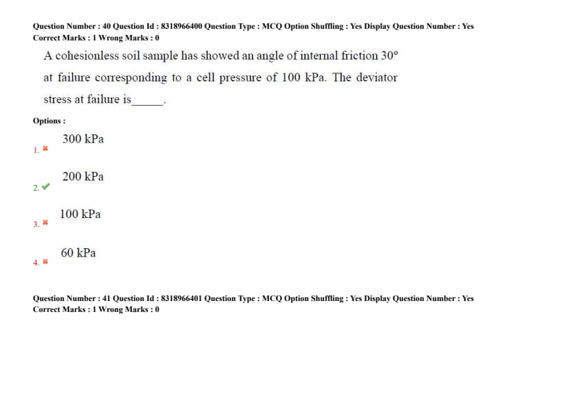 A cohesionless soil sample has showed an angle of internal friction 30\(^\circ\) at failure corresponding to a cell pressure of 100 kPa. The deviator stress at failure is..........