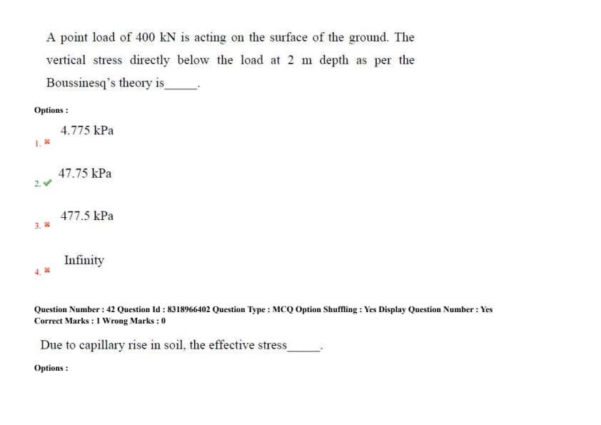 A point load of 400 kN is acting on the surface of the ground. The vertical stress directly below the load at 2 m depth as per the Boussinesq’s theory is .........