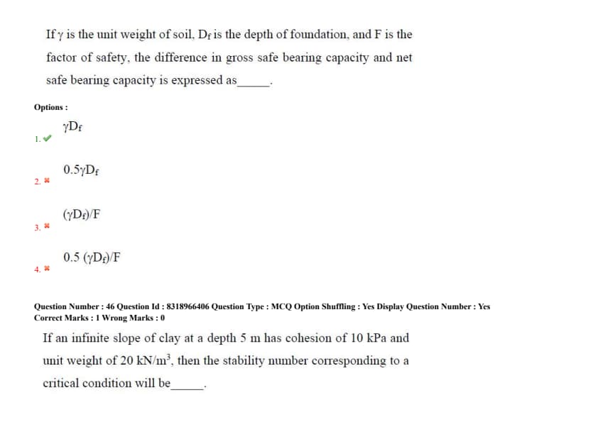 If \( \gamma \) is the unit weight of soil, \( D_f \) is the depth of foundation, and \( F \) is the factor of safety, the difference in gross safe bearing capacity and net safe bearing capacity is expressed as ............