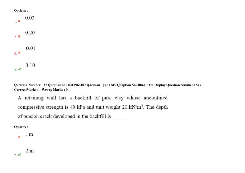 A retaining wall has a backfill of pure clay whose unconfined compressive strength is 40 kPa and unit weight 20 kN/m\(^3\). The depth of tension crack developed in the backfill is ............