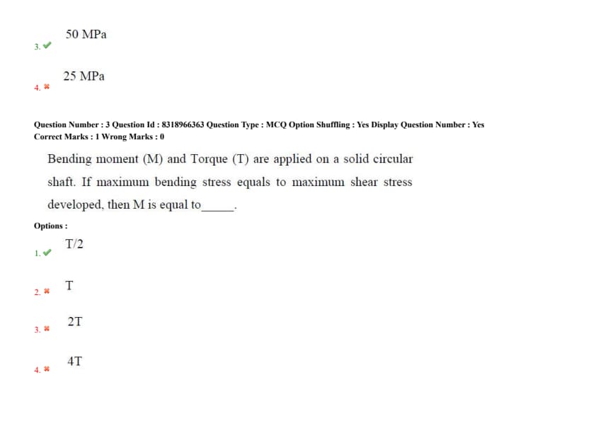 Bending moment (M) and Torque (T) are applied on a solid circular shaft. If maximum bending stress equals to maximum shear stress developed, then M is equal to ..........