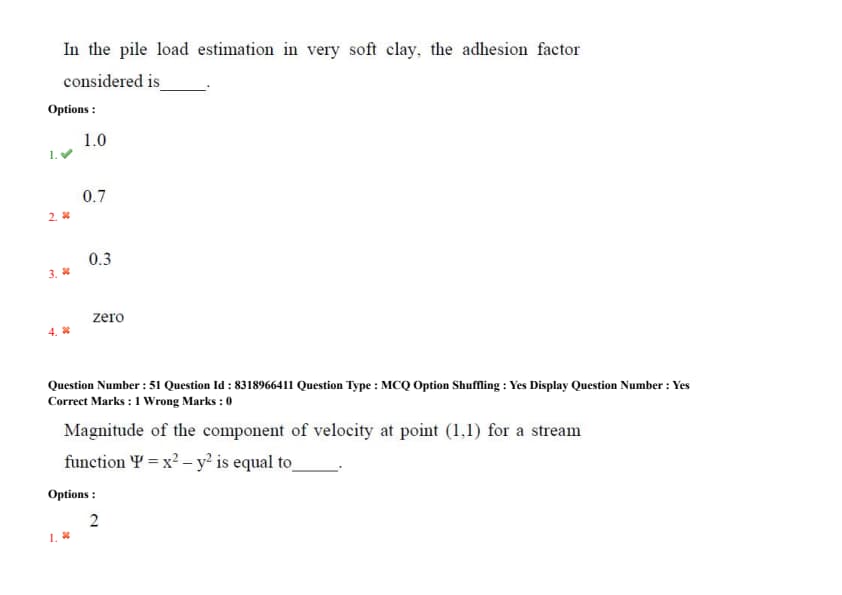 In the pile load estimation in very soft clay, the adhesion factor considered is ............