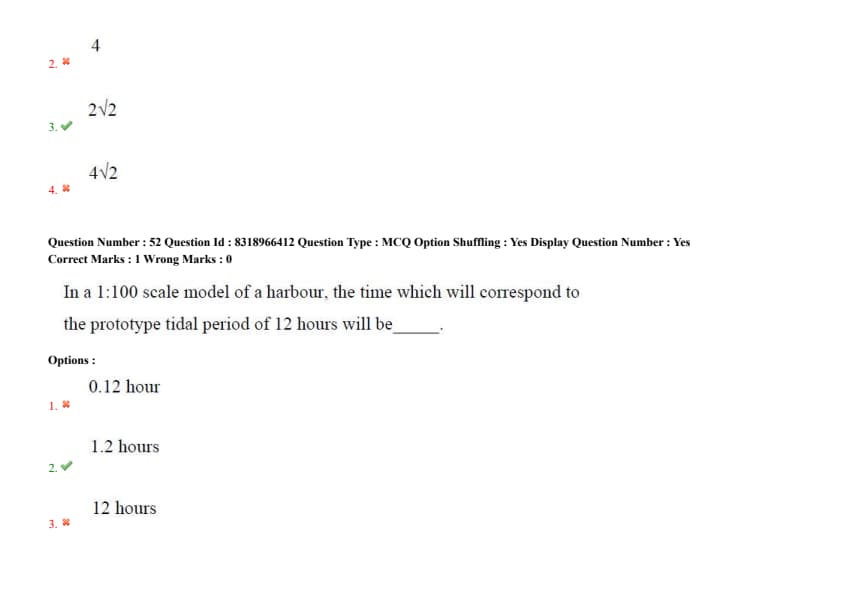 In a 1:100 scale model of a harbour, the time which will correspond to the prototype tidal period of 12 hours will be ............