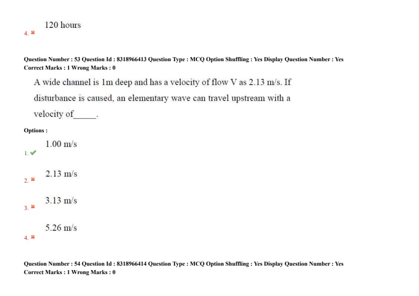 A wide channel is 1 m deep and has a velocity of flow \( V = 2.13 \, m/s \). If a disturbance is caused, an elementary wave can travel upstream with a velocity of ............