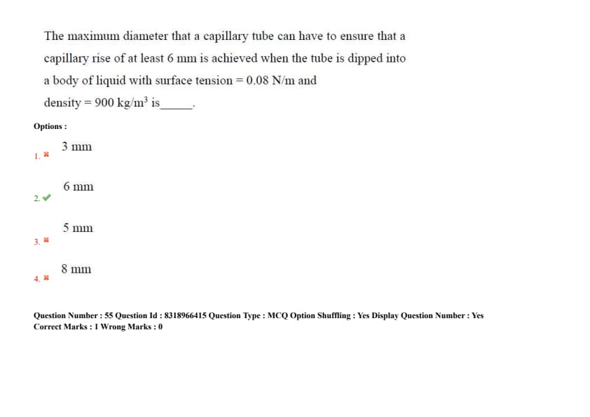 The maximum diameter that a capillary tube can have to ensure that a capillary rise of at least 6 mm is achieved when the tube is dipped into a body of liquid with surface tension \( = 0.08 \, N/m \) and density \( = 900 \, kg/m^3 \) is ...........