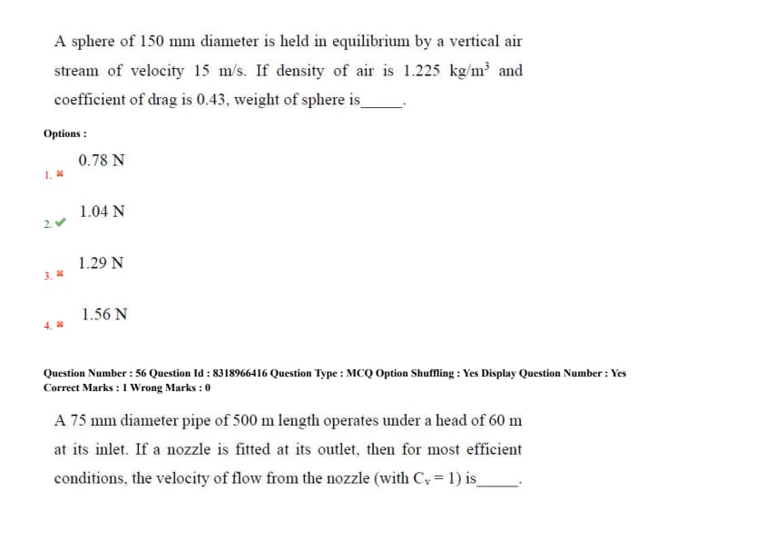 A sphere of 150 mm diameter is held in equilibrium by a vertical air stream of velocity 15 m/s. If the density of air is \( 1.225 \, kg/m^3 \) and the coefficient of drag is 0.43, the weight of the sphere is ...........