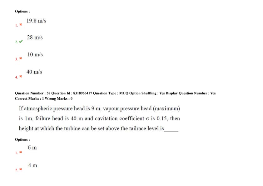 If atmospheric pressure head is 9 m, vapour pressure head (maximum) is 1 m, failure head is 40 m and cavitation coefficient \( \sigma \) is 0.15, then height at which the turbine can be set above the tailrace level is ...........
