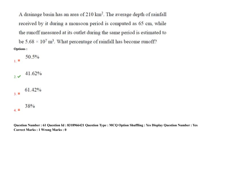 A drainage basin has an area of 210 km\(^2\). The average depth of rainfall received by it during a monsoon period is computed as 65 cm, while the runoff measured at its outlet during the same period is estimated to be \(5.68 \times 10^7\) m\(^3\). What percentage of rainfall has become runoff?