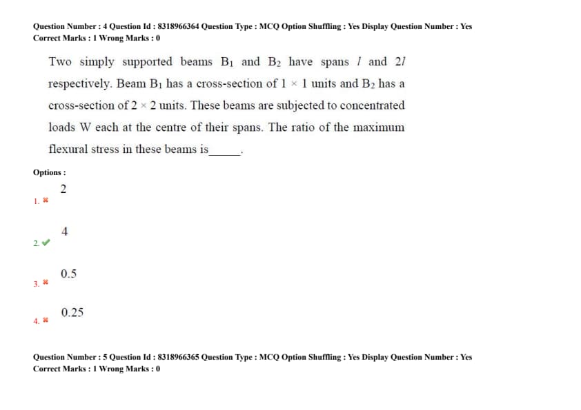 Two simply supported beams \( B_1 \) and \( B_2 \) have spans \( l \) and \( 2l \) respectively. Beam \( B_1 \) has a cross-section of \( 1 \times 1 \) units and \( B_2 \) has a cross-section of \( 2 \times 2 \) units. These beams are subjected to concentrated loads \( W \) each at the centre of their spans. The ratio of the maximum flexural stress in these beams is ............