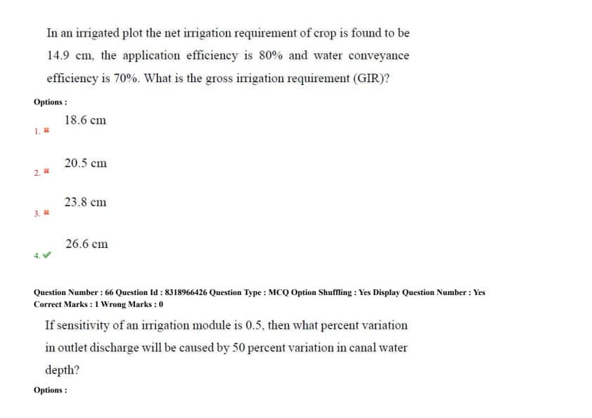 In an irrigated plot the net irrigation requirement of crop is found to be 14.9 cm, the application efficiency is 80% and water conveyance efficiency is 70%. What is the gross irrigation requirement (GIR)?
