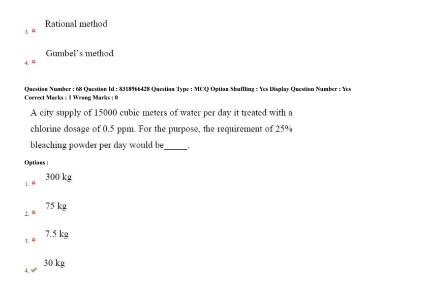 A city supply of 15000 cubic meters of water per day is treated with a chlorine dosage of 0.5 ppm. For the purpose, the requirement of 25% bleaching powder per day would be .......