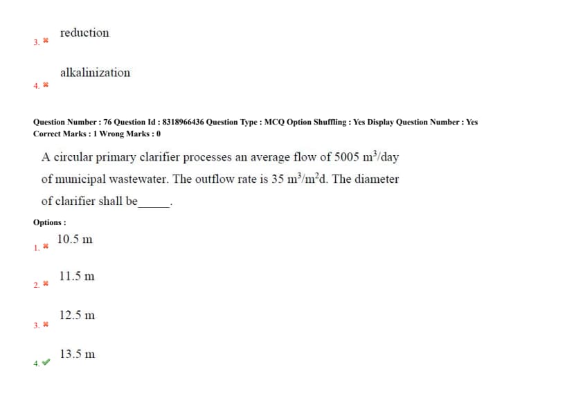 A circular primary clarifier processes an average flow of 5005 m\(^3\)/day of municipal wastewater. The outflow rate is 35 m\(^3\)/m\(^2\)·d. The diameter of clarifier shall be ........