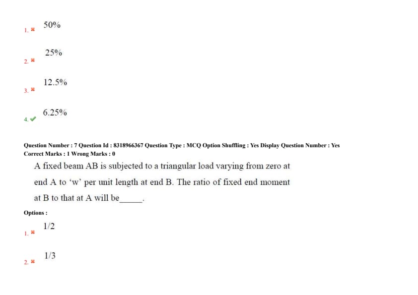 A fixed beam AB is subjected to a triangular load varying from zero at end A to \( w \) per unit length at end B. The ratio of fixed end moment at B to that at A will be ............