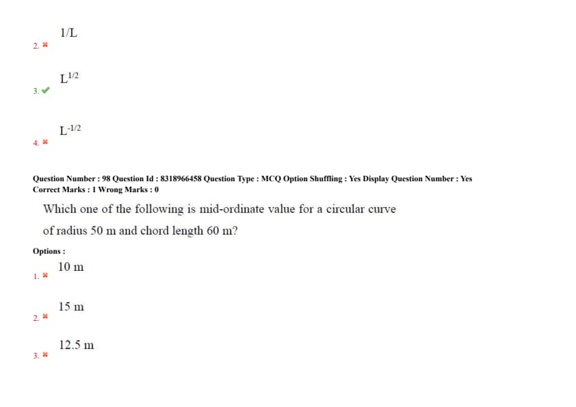 Which one of the following is mid-ordinate value for a circular curve of radius 50 m and chord length 60 m?