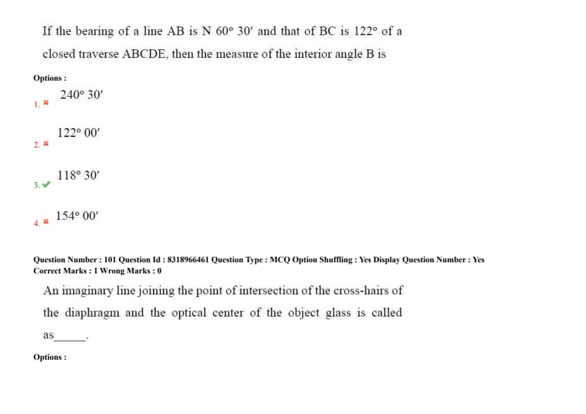 If the bearing of a line AB is N 60° 30′ and that of BC is 122° of a closed traverse ABCDE, then the measure of the interior angle B is .......