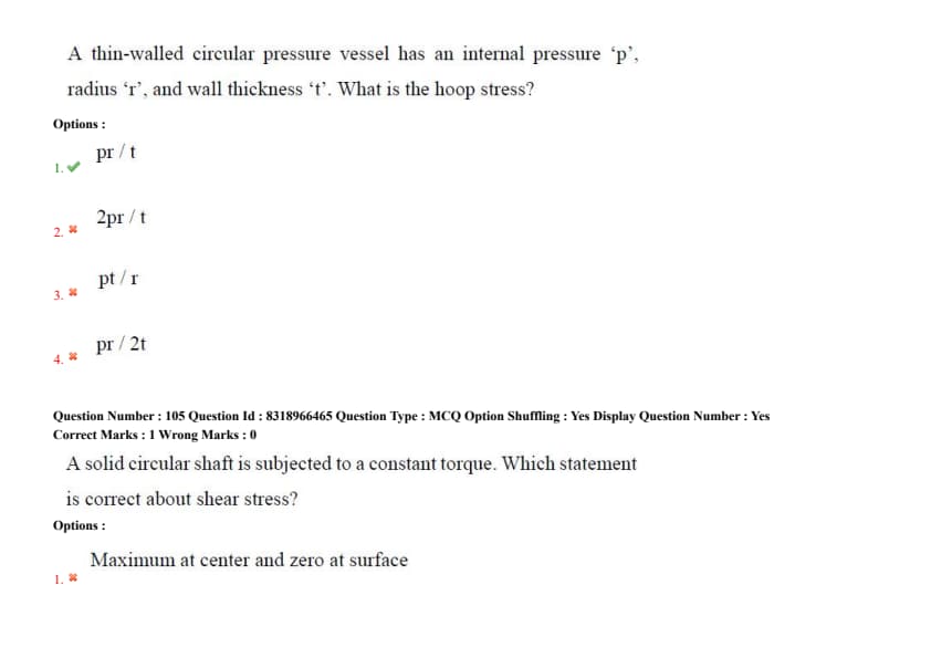 A thin-walled circular pressure vessel has an internal pressure ‘\( p \)’, radius ‘\( r \)’, and wall thickness ‘\( t \)’. What is the hoop stress?