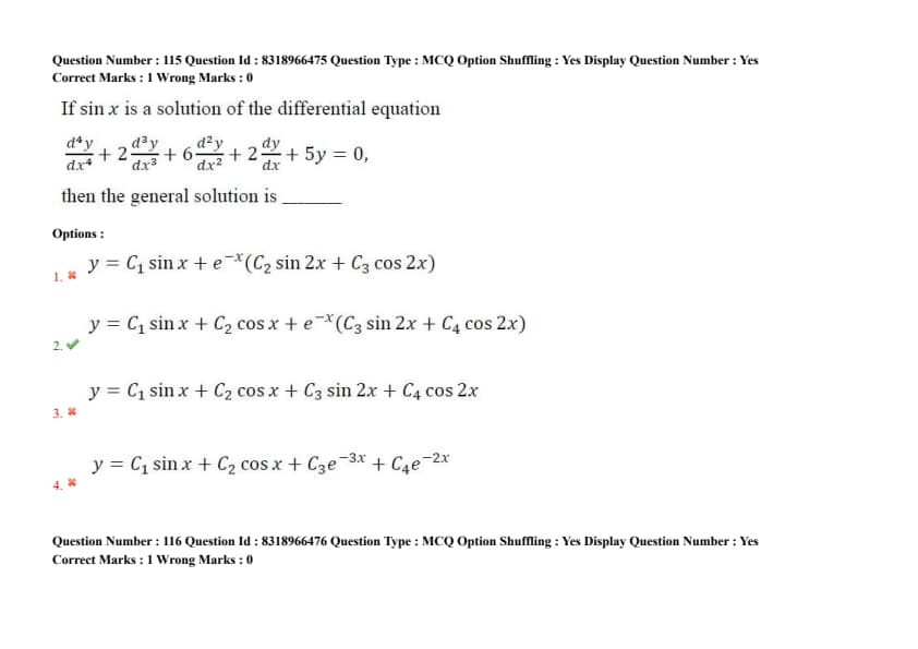 If \( \sin x \) is a solution of the differential equation \[ \dfrac{d^4 y}{dx^4} + 2 \dfrac{d^3 y}{dx^3} + 6 \dfrac{d^2 y}{dx^2} + 2 \dfrac{dy}{dx} + 5y = 0, \]