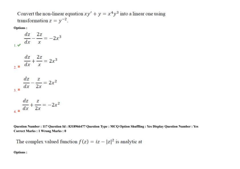 \textbf{Rewriting:} \[ \dfrac{y'}{y^3} = -\dfrac{1}{2} \dfrac{dz}{dx} \] Substitute into the equation: \[ x \left( -\dfrac{1}{2} \dfrac{dz}{dx} \right) + z = x^4 \Rightarrow -\dfrac{x}{2} \dfrac{dz}{dx} + z = x^4 \] Multiply through by 2: \[ - x \dfrac{dz}{dx} + 2z = 2x^4 \Rightarrow \dfrac{dz}{dx} - \dfrac{2z}{x} = -2x^3 \] \textbf{Final Answer:} \( \boxed{\dfrac{dz}{dx} - \dfrac{2z}{x} = -2x^3} \)