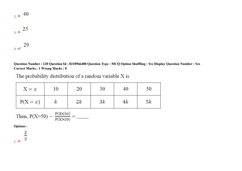 Then, \( P(X=50) - \frac{P(X<30)}{P(X>20)} \) = ...........