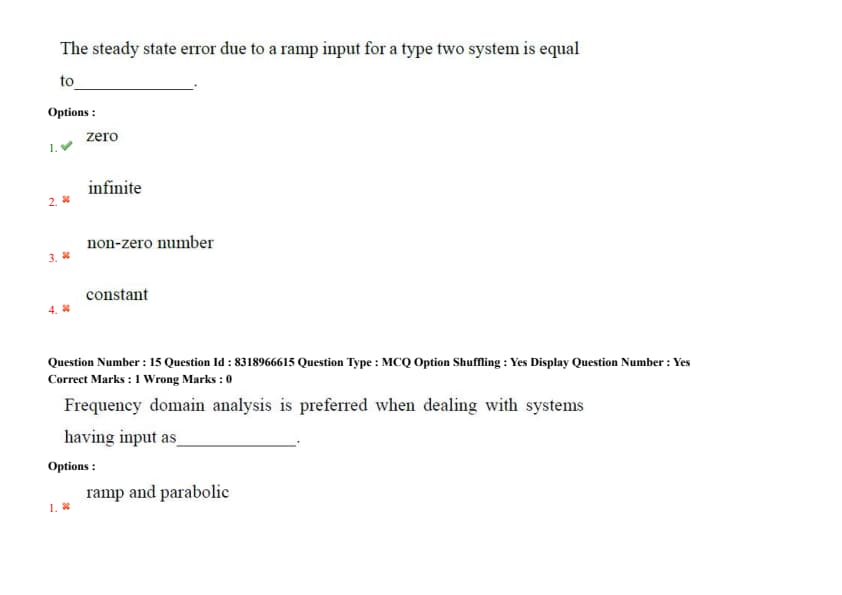 The steady state error due to a ramp input for a type two system is equal to ____.