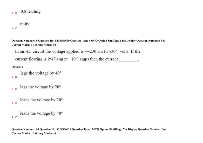 In an AC circuit the voltage applied is \(v = 230\sin(\omega t - 30^\circ)\) volts. If the current flowing is \(i = 47\sin(\omega t + 10^\circ)\) amps, then the current _____.