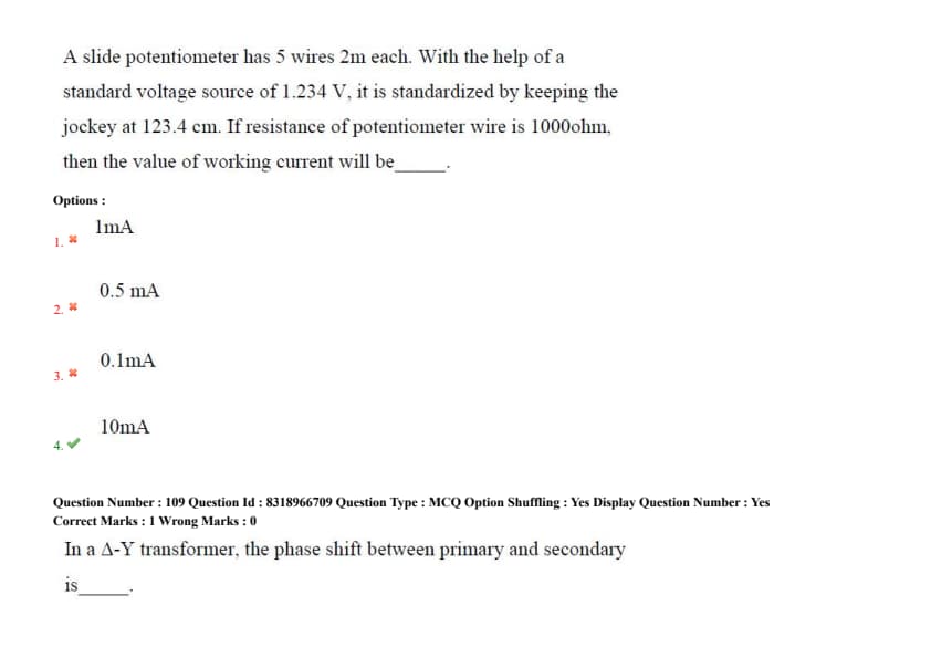 A slide potentiometer has 5 wires 2m each. With the help of a standard voltage source of 1.234 V, it is standardized by keeping the jockey at 123.4 cm. If resistance of potentiometer wire is 10000\(\Omega\), then the value of working current will be ____.