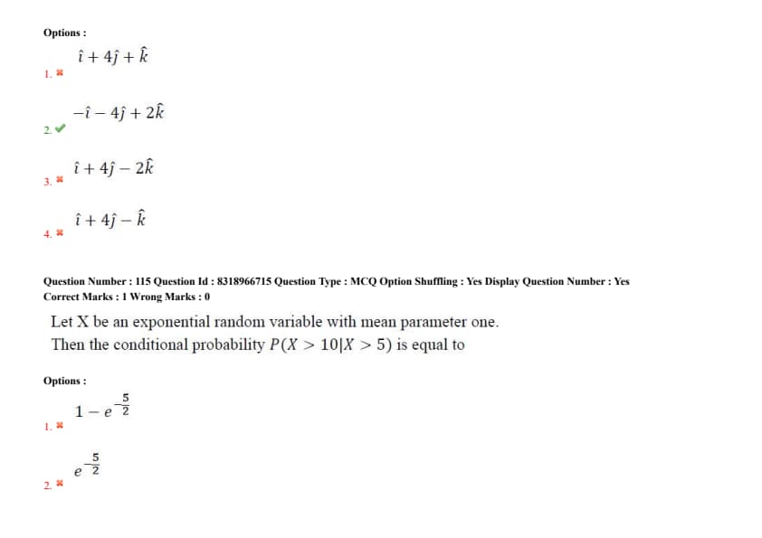 Let \(X\) be an exponential random variable with mean parameter one. Then the conditional probability \(P(X > 10 | X > 5)\) is equal to