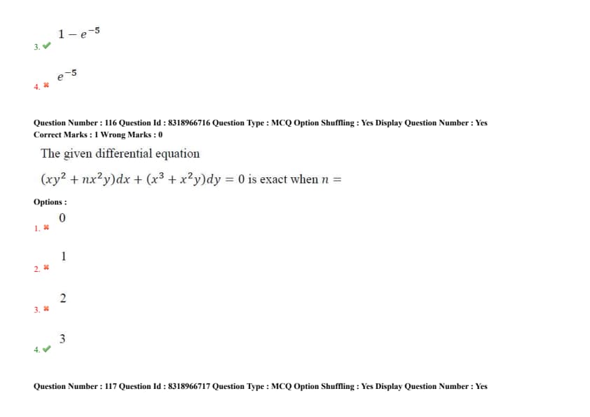 \((x y^2 + n x^2 y) dx + (x^3 + x^2 y) dy = 0\) is exact when \(n =\)