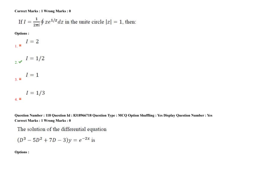 If \(I = \frac{1}{2\pi i} \oint \frac{z e^{1/z}}{z} \, dz\) in the unit circle \(|z| = 1\), then:
